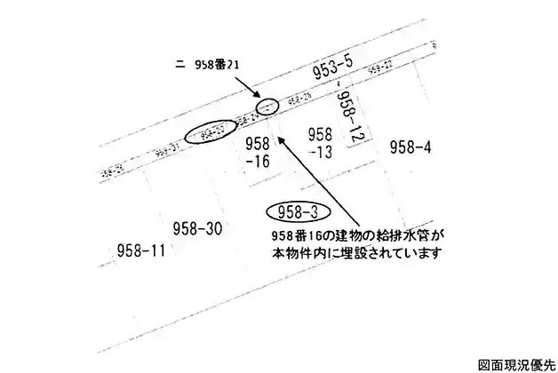 | 設備 | 都市ガス、上水道、下水道、本物件内に隣地建物の給排水管が埋設されています、地番958-20・958-21以外の道路部分についての所有権無、私道負担有(2項道路)、出し出し道路、一部通行承諾書有(地番953-5) | ||