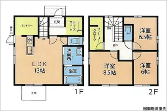| 設備 | トイレ2ヶ所、システムキッチン、カウンターキッチン、IHクッキングヒーター、上水道、下水道、モニタ付インターホン、駐車場3台分、サンルーム、パントリー、FCL、SIC、リビング階段 | ||