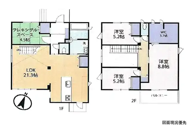 | 設備 | トイレ2ヶ所、システムキッチン、カウンターキッチン、IHクッキングヒーター、ウォークインクローゼット、床下収納、上水道、下水道、モニタ付インターホン、庭、駐車場2台分、フレキシブルスペース、リビング階段 | ||