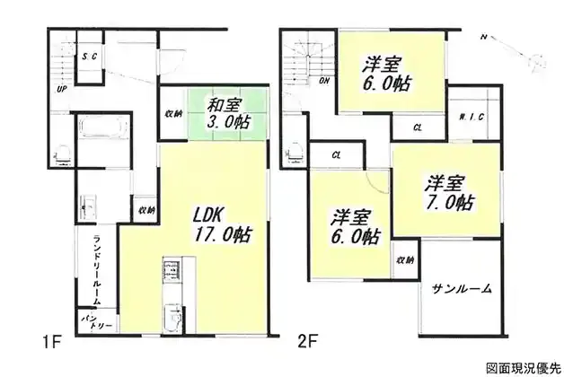 | 設備 | 温水洗浄便座、トイレ2ヶ所、システムキッチン、カウンターキッチン、IHクッキングヒーター、ウォークインクローゼット、洗髪洗面化粧台、上水道、下水道、モニタ付インターホン、駐車場2台分、SIC、ランドリールーム・サンルーム、パントリー | ||