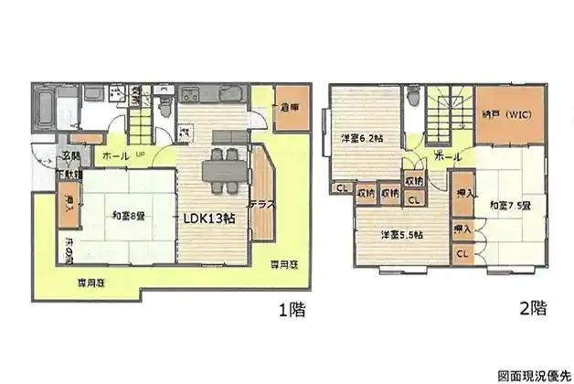 | 設備 | トイレ2ヶ所、浴室乾燥機、システムキッチン、洗髪洗面化粧台、上水道、下水道、モニタ付インターホン、庭、倉庫、納戸、全居室収納、テラス、ウッドデッキ | ||