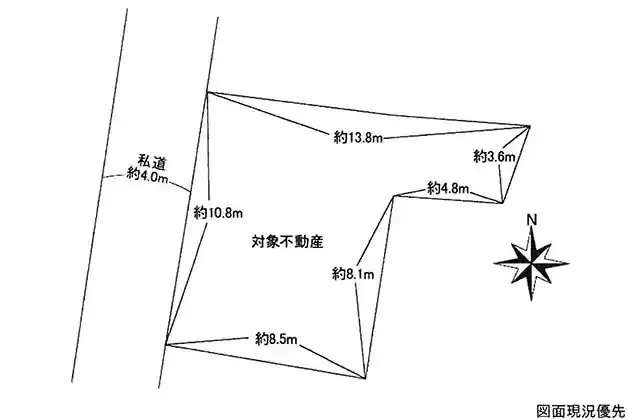 | 接道状況 | 西4m 私道 接面10.8m 一方道路 | ||