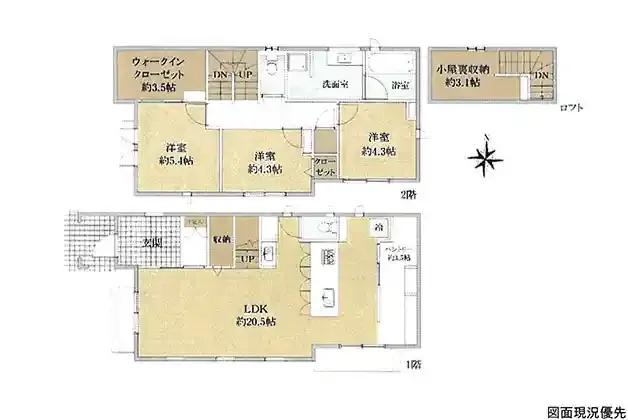 | 設備 | 温水洗浄便座、トイレ2ヶ所、追焚機能、浴室乾燥機、システムキッチン、カウンターキッチン、IHクッキングヒーター、食器洗浄乾燥機、ウォークインクローゼット、床下収納、洗髪洗面化粧台、グルニエ、電気、上水道、下水道、複層ガラス、モニタ付インターホン、駐車場2台分、パントリー(3.5帖)、リビング階段 | ||
