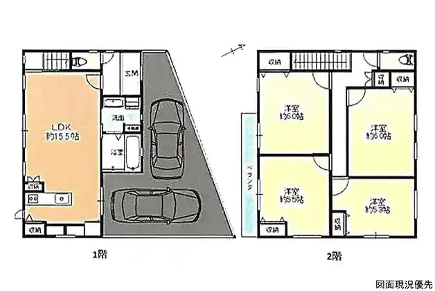 | 設備 | 温水洗浄便座、トイレ2ヶ所、追焚機能、浴室乾燥機、システムキッチン、カウンターキッチン、IHクッキングヒーター、浄水器、食器洗浄乾燥機、床下収納、洗髪洗面化粧台、上水道、下水道、モニタ付インターホン、駐車場2台分、全居室収納、リビング階段 | ||