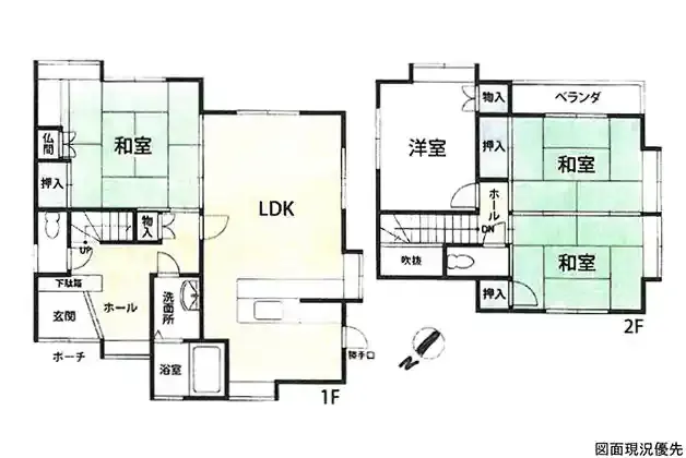 | 特徴 | 日当り良好、吹抜、令和7年6月末リフォーム済:ユニットバス・キッチン・洗面化粧台交換、キッチンパネル、内部塗装、クロス・クッションフロアー・畳・襖・障子貼替、ドアシート、ハウスクリーニング、照明付 | ||