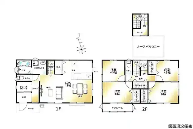 | 設備 | 温水洗浄便座、トイレ2ヶ所、追焚機能、システムキッチン、カウンターキッチン、IHクッキングヒーター、浄水器、食器洗浄乾燥機、床下収納、洗髪洗面化粧台、電気、上水道、下水道、複層ガラス、モニタ付インターホン、ルーフバルコニー、駐車場2台分、SIC、サンルーム、リビング階段 | ||