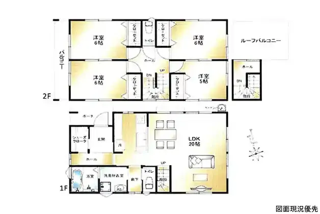 | 設備 | 温水洗浄便座、トイレ2ヶ所、追焚機能、浴室乾燥機、システムキッチン、カウンターキッチン、IHクッキングヒーター、食器洗浄乾燥機、床下収納、洗髪洗面化粧台、電気、上水道、下水道、複層ガラス、モニタ付インターホン、ルーフバルコニー、駐車場2台分、SIC、リビング階段 | ||
