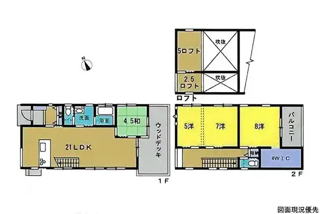 | 設備 | トイレ2ヶ所、システムキッチン、カウンターキッチン、IHクッキングヒーター、ウォークインクローゼット、上水道、下水道、モニタ付インターホン、駐車場3台分、ロフト×2、ウッドデッキ、リビング階段 | ||
