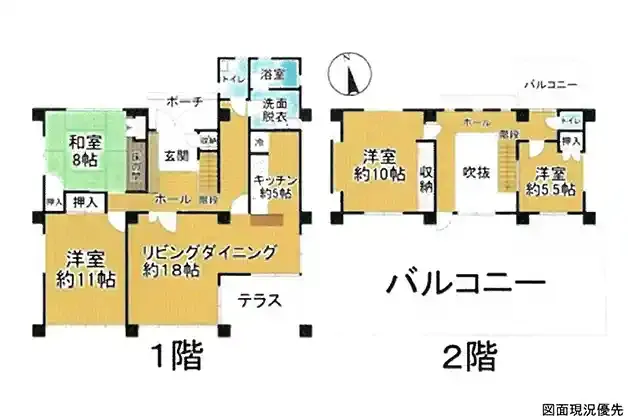 | 設備 | トイレ2ヶ所、システムキッチン、都市ガス、上水道、下水道、ルーフバルコニー、庭、駐車場2台分、テラス | ||