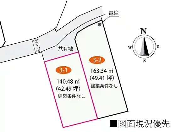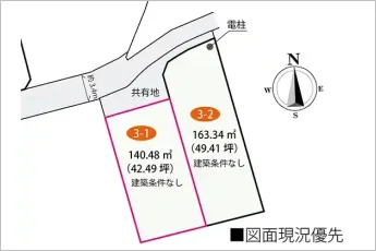 | 諸条件・相談 | ※造成工事 R07年11月下旬完了予定 ※共有地38.95㎡有 ※土地面積は造成工事前および確定測量前につき、多少増減する場合があります。 | ||