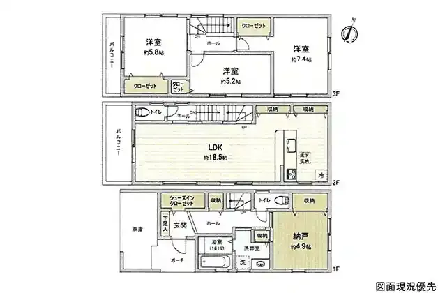 | 設備 | トイレ2ヶ所、システムキッチン、カウンターキッチン、IHクッキングヒーター、床下収納、洗髪洗面化粧台、上水道、下水道、モニタ付インターホン、納戸(約4.9帖)、リビング階段、パントリー、カップボード、バルコニー2ヶ所、各居室収納、SIC | ||