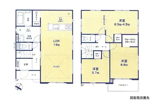 | 設備 | 温水洗浄便座、トイレ2ヶ所、追焚機能、浴室乾燥機、システムキッチン、カウンターキッチン、IHクッキングヒーター、浄水器、食器洗浄乾燥機、ウォークインクローゼット、床下収納、洗髪洗面化粧台、上水道、下水道、モニタ付インターホン、駐車場2台分、パントリー、折上天井 | ||