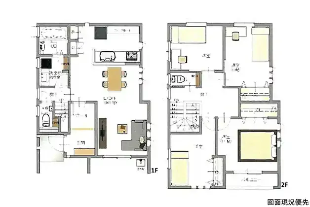 | 設備 | トイレ2ヶ所、システムキッチン、カウンターキッチン、照明器具、都市ガス、上水道、下水道、モニタ付インターホン、駐車場2台分、納戸(5.3帖)、カップボード、室内物干し、EVコンセント、宅配Box、トイレ手洗い別 | ||
