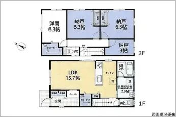 | 設備 | 温水洗浄便座、トイレ2ヶ所、追焚機能、浴室乾燥機、システムキッチン、カウンターキッチン、浄水器、食器洗浄乾燥機、ウォークインクローゼット、床下収納、洗髪洗面化粧台、電気、都市ガス、上水道、下水道、複層ガラス、モニタ付インターホン、駐車場2台分、納戸×3(3帖・6.3帖・6.3帖)、乾太くん | ||