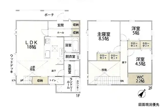 | 設備 | システムキッチン、カウンターキッチン、IHクッキングヒーター、食器洗浄乾燥機、ウォークインクローゼット、床下収納、洗髪洗面化粧台、モニタ付インターホン、駐車場2台分、ウッドデッキ、ランドリールーム、全室カーテン、玄関ドア電子錠、リビング階段 | ||