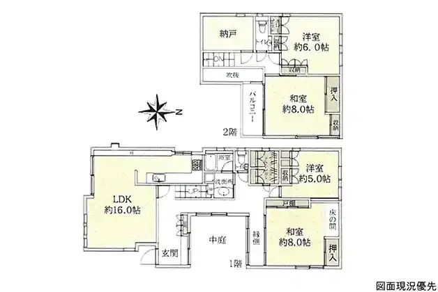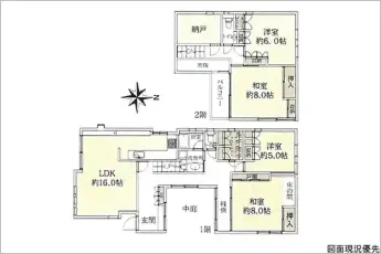 | 設備 | トイレ2ヶ所、システムキッチン、ウォークインクローゼット、洗髪洗面化粧台、都市ガス、上水道、下水道、庭、駐車場2台分、縁側、納戸、L型キッチン | ||