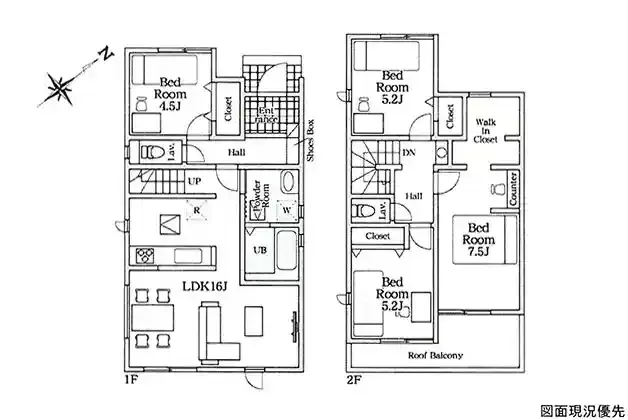 | 設備 | 温水洗浄便座、トイレ2ヶ所、追焚機能、浴室乾燥機、システムキッチン、カウンターキッチン、浄水器、ウォークインクローゼット、床下収納、洗髪洗面化粧台、照明器具、電気、都市ガス、上水道、下水道、複層ガラス、モニタ付インターホン、ルーフバルコニー、駐車場2台分、リビング階段、宅配Box | ||