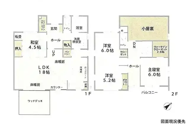 | 設備 | トイレ2ヶ所、システムキッチン、カウンターキッチン、ウォークインクローゼット、グルニエ、都市ガス、上水道、下水道、床暖房、モニタ付インターホン、駐車場2台分、SIC、パントリー、リビング階段、ウッドデッキ | ||