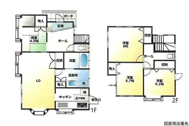 | 設備 | 温水洗浄便座、トイレ2ヶ所、追焚機能、浴室乾燥機、システムキッチン、床下収納、洗髪洗面化粧台、電気、都市ガス、上水道、下水道、庭、駐車場2台分、倉庫 | ||