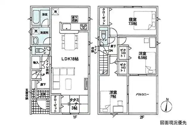 | 設備 | 温水洗浄便座、トイレ2ヶ所、浴室乾燥機、システムキッチン、カウンターキッチン、浄水器、床下収納、洗髪洗面化粧台、照明器具、都市ガス、上水道、下水道、複層ガラス、モニタ付インターホン、防犯カメラ、ルーフバルコニー、駐車場2台分、タタミコーナー(3帖) | ||