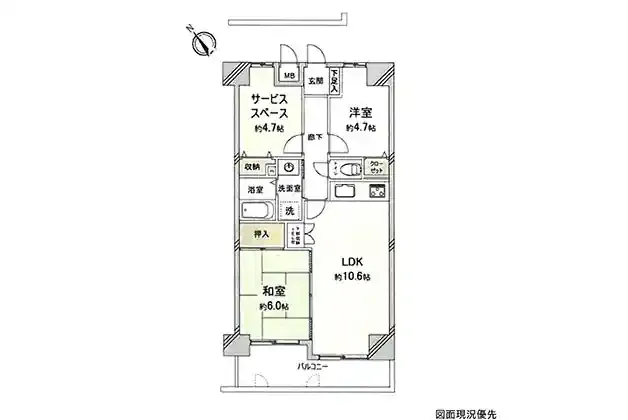 | 設備 | 温水洗浄便座、システムキッチン、室内洗濯機置場、エレベーター、照明器具、オートロック、モニタ付インターホン、防犯カメラ、バイク置き場、駐輪場、サービススペース(4.7帖) | ||