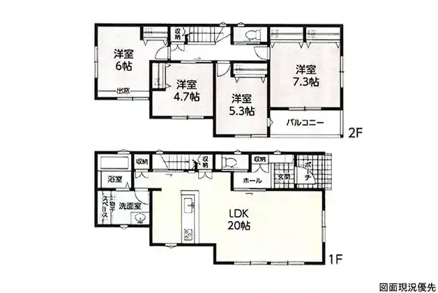 | 設備 | トイレ2ヶ所、システムキッチン、カウンターキッチン、洗髪洗面化粧台、都市ガス、モニタ付インターホン、駐車場4台分、室内物干し、リビング階段 | ||
