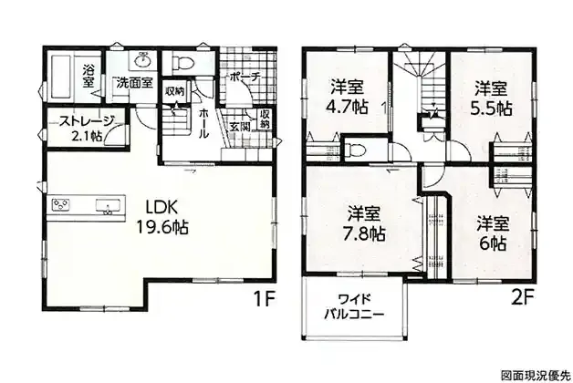 | 設備 | トイレ2ヶ所、システムキッチン、カウンターキッチン、IHクッキングヒーター、洗髪洗面化粧台、浄化槽、モニタ付インターホン、駐車場3台分、ストレージ(約2.1帖)、ワイドバルコニー | ||