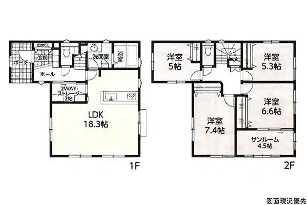 | 設備 | トイレ2ヶ所、システムキッチン、カウンターキッチン、IHクッキングヒーター、洗髪洗面化粧台、モニタ付インターホン、駐車場2台分、サンルーム(4.5帖)、ストレージ(2帖) | ||