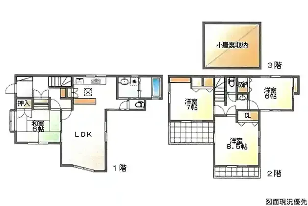 | 設備 | 温水洗浄便座、トイレ2ヶ所、追焚機能、浴室乾燥機、システムキッチン、食器洗浄乾燥機、床下収納、洗髪洗面化粧台、グルニエ、照明器具、都市ガス、上水道、下水道、モニタ付インターホン、ウッドデッキ、コンロ3口、全居室収納 | ||