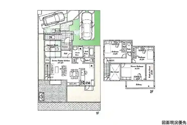 | 設備 | トイレ2ヶ所、システムキッチン、カウンターキッチン、ウォークインクローゼット、床下収納、上水道、下水道、モニタ付インターホン、庭、駐車場2台分、リビング階段、宅配Box、外部物置、カバードポーチ | ||