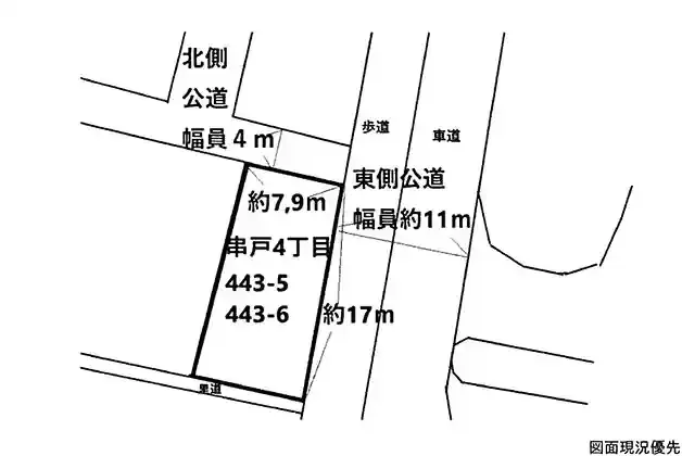 | 接道状況 | 北4m 公道 接面7.9m 東11m 公道 接面17m 角地 | ||