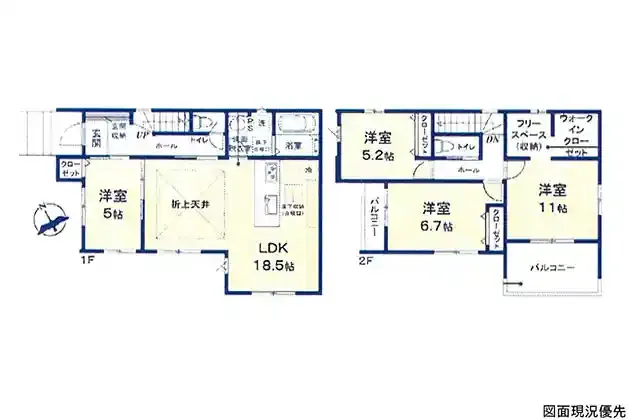 設備 | トイレ2ヶ所、システムキッチン、カウンターキッチン、食器洗浄乾燥機、ウォークインクローゼット、床下収納、洗髪洗面化粧台、都市ガス、上水道、下水道、モニタ付インターホン、駐車場2台分、フリースペース、バルコニー2ヶ所、折上天井 | ||