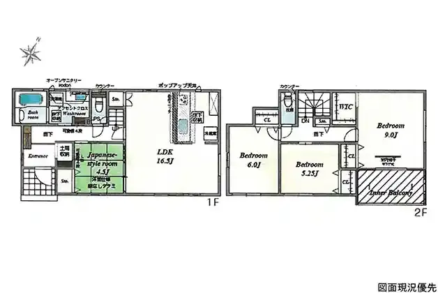 | 設備 | 温水洗浄便座、トイレ2ヶ所、追焚機能、浴室乾燥機、システムキッチン、カウンターキッチン、浄水器、食器洗浄乾燥機、ウォークインクローゼット、床下収納、洗髪洗面化粧台、照明器具、電気、都市ガス、上水道、下水道、複層ガラス、モニタ付インターホン、駐車場3台分、収納充実、土間収納 | ||