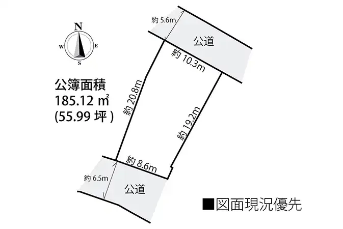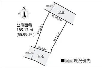 | 接道状況 | 北東5.6m 公道 接面10.3m 南西6.5m 公道 接面8.6m 二方道路(除角地) | ||