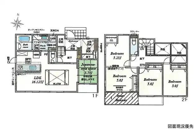 | 特徴 | 吹抜、オール電化、制振ダンパー、耐震等級3の住宅性能評価、長期優良住宅、エネルギー消費性能星3つ、太陽光パネル(月額利用料要) | ||