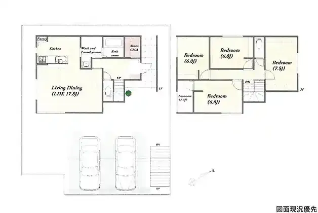 | 設備 | 温水洗浄便座、トイレ2ヶ所、追焚機能、システムキッチン、カウンターキッチン、IHクッキングヒーター、浄水器、食器洗浄乾燥機、床下収納、洗髪洗面化粧台、電気、上水道、下水道、複層ガラス、モニタ付インターホン、駐車場2台分、SIC、ランドリールーム・サンルーム、パントリー、勝手口 | ||