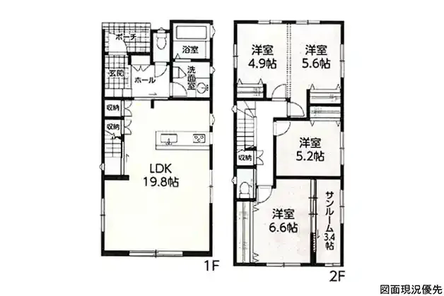 | 設備 | トイレ2ヶ所、システムキッチン、カウンターキッチン、洗髪洗面化粧台、都市ガス、下水道、モニタ付インターホン、駐車場2台分、サンルーム、リビング階段 | ||