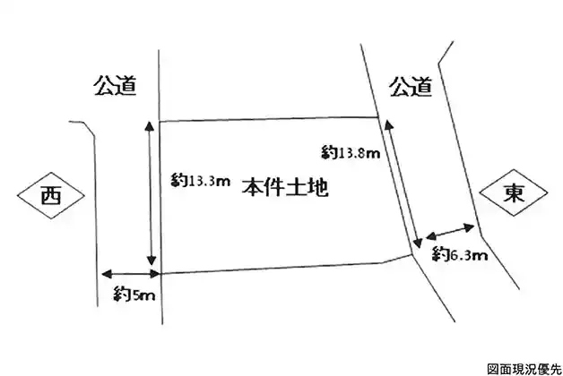 | 接道状況 | 西5m 公道 接面13.3m 東6.3m 公道 接面13.8m 二方道路(除角地) | ||