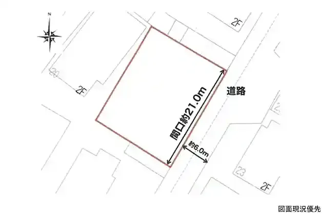 前面道路は南東約6m!間口は約21m!