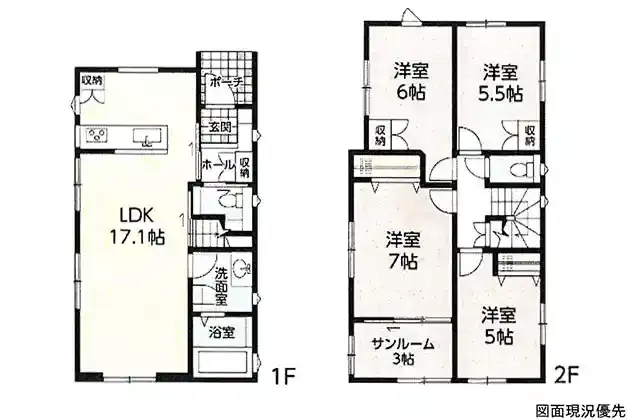 | 設備 | トイレ2ヶ所、システムキッチン、カウンターキッチン、洗髪洗面化粧台、都市ガス、下水道、モニタ付インターホン、駐車場2台分、サンルーム(3帖)、リビング階段 | ||