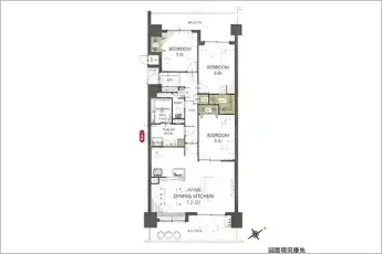 | 設備 | 浴室乾燥機、システムキッチン、カウンターキッチン、ウォークインクローゼット、室内洗濯機置場、エレベーター、洗髪洗面化粧台、宅配BOX、オートロック、二面バルコニー、バイク置き場、駐輪場、(アルコーブ:1.31㎡) | ||
