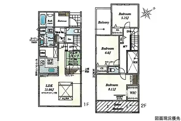 | 設備 | トイレ2ヶ所、浴室乾燥機、システムキッチン、カウンターキッチン、食器洗浄乾燥機、ウォークインクローゼット、床下収納、洗髪洗面化粧台、照明器具、都市ガス、上水道、下水道、複層ガラス、モニタ付インターホン、駐車場2台分、マルチスキップ(3帖)、収納充実、インナーバルコニー6.83㎡、折上天井 | ||