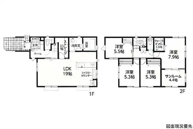 | 設備 | トイレ2ヶ所、システムキッチン、カウンターキッチン、IHクッキングヒーター、ウォークインクローゼット、洗髪洗面化粧台、モニタ付インターホン、駐車場4台分、ストレージ(2.5帖)、サンルーム(4.4帖) | ||