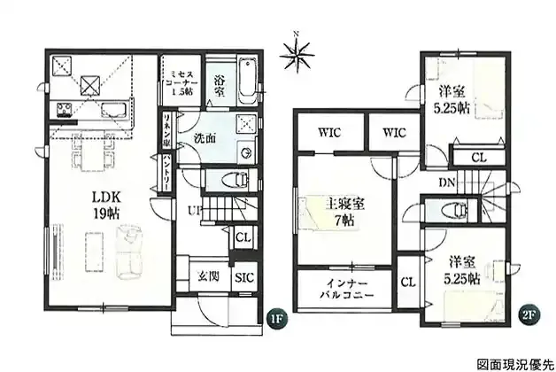 | 設備 | トイレ2ヶ所、システムキッチン、カウンターキッチン、IHクッキングヒーター、ウォークインクローゼット、床下収納、洗髪洗面化粧台、上水道、下水道、複層ガラス、モニタ付インターホン、駐車場2台分、SIC、ミセスコーナー(1.5帖) | ||