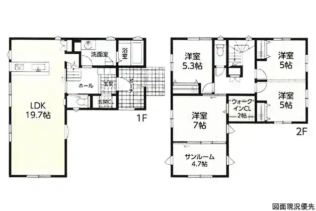 | 設備 | トイレ2ヶ所、システムキッチン、カウンターキッチン、ウォークインクローゼット、洗髪洗面化粧台、都市ガス、モニタ付インターホン、駐車場3台分、サンルーム(4.7帖)、玄関CL | ||