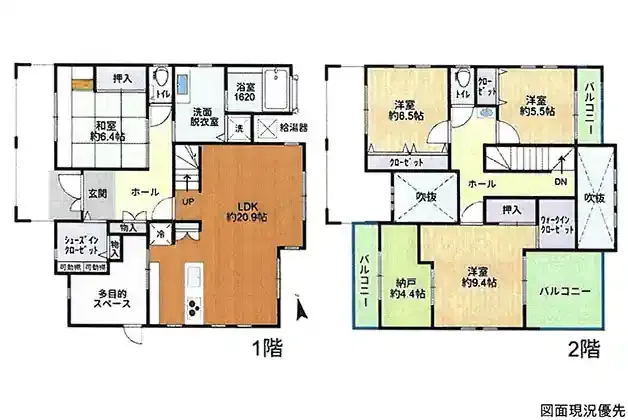 | 設備 | 温水洗浄便座、トイレ2ヶ所、追焚機能、浴室乾燥機、システムキッチン、カウンターキッチン、IHクッキングヒーター、浄水器、食器洗浄乾燥機、ウォークインクローゼット、都市ガス、上水道、下水道、床暖房、駐車場2台分、SIC、多目的スペース、納戸(約4.4帖)、三面バルコニー、各居室収納、リビング階段 | ||