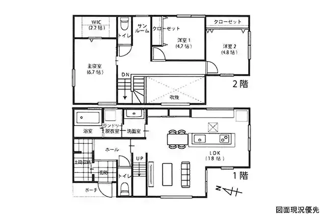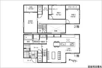 | 設備 | トイレ2ヶ所、浴室乾燥機、システムキッチン、IHクッキングヒーター、食器洗浄乾燥機、ウォークインクローゼット、床下収納、洗髪洗面化粧台、照明器具、上水道、下水道、エアコン、モニタ付インターホン、駐車場2台分、サンルーム、全居室収納、土間収納、アイランドキッチン、リビング階段 | ||
