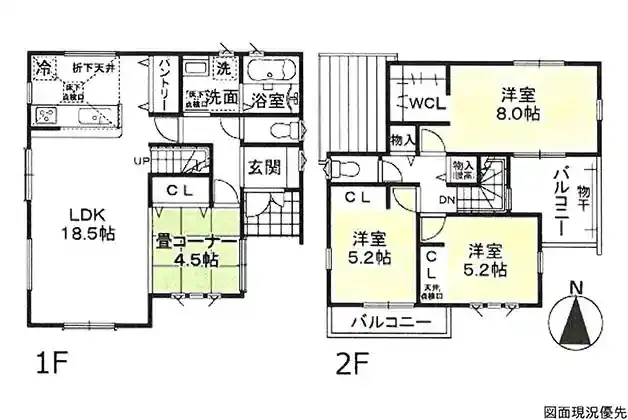 | 設備 | 温水洗浄便座、トイレ2ヶ所、浴室乾燥機、システムキッチン、カウンターキッチン、浄水器、ウォークインクローゼット、床下収納、洗髪洗面化粧台、都市ガス、上水道、下水道、複層ガラス、モニタ付インターホン、駐車場3台分、畳コーナー(4.5帖)、パントリー、タグキー、宅配Box | ||