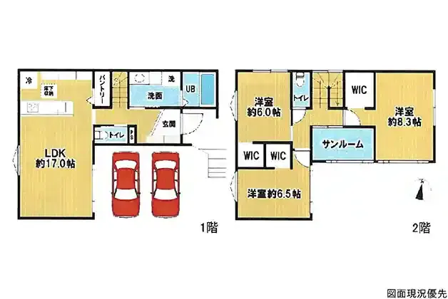 | 設備 | トイレ2ヶ所、システムキッチン、カウンターキッチン、IHクッキングヒーター、ウォークインクローゼット、床下収納、洗髪洗面化粧台、上水道、下水道、モニタ付インターホン、駐車場2台分、サンルーム、パントリー | ||