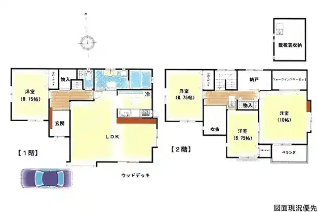 | 設備 | 温水洗浄便座、システムキッチン、カウンターキッチン、ウォークインクローゼット、床下収納、グルニエ、都市ガス、上水道、下水道、納戸、ウッドデッキ | ||